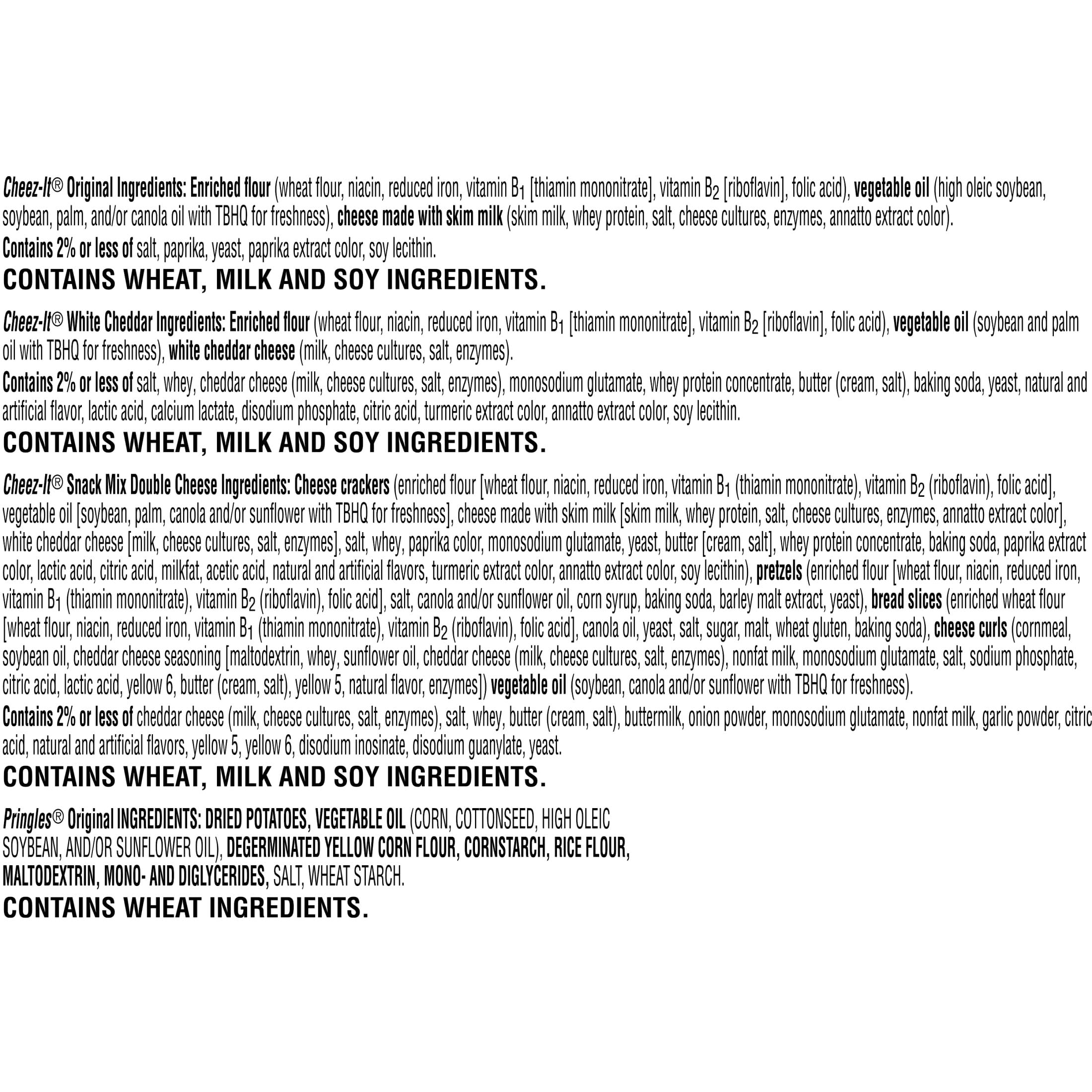 - Includes one 16.95oz box containing 5 Cheez-It Original, 5 Pringles Original cups, 5 Cheez-It White Cheddar, and 5 Cheez-It Double Cheese Snack Mix