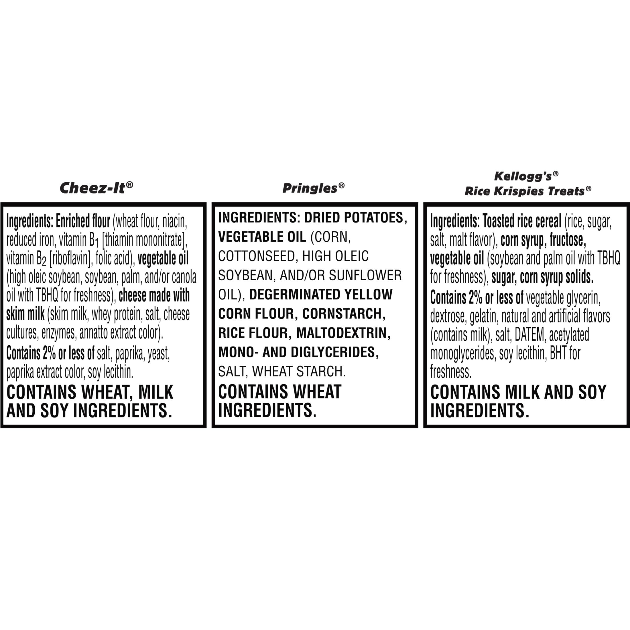 - Variety pack includes Cheez-It Original, Pringles Original, and Rice Krispies Treats Original snacks