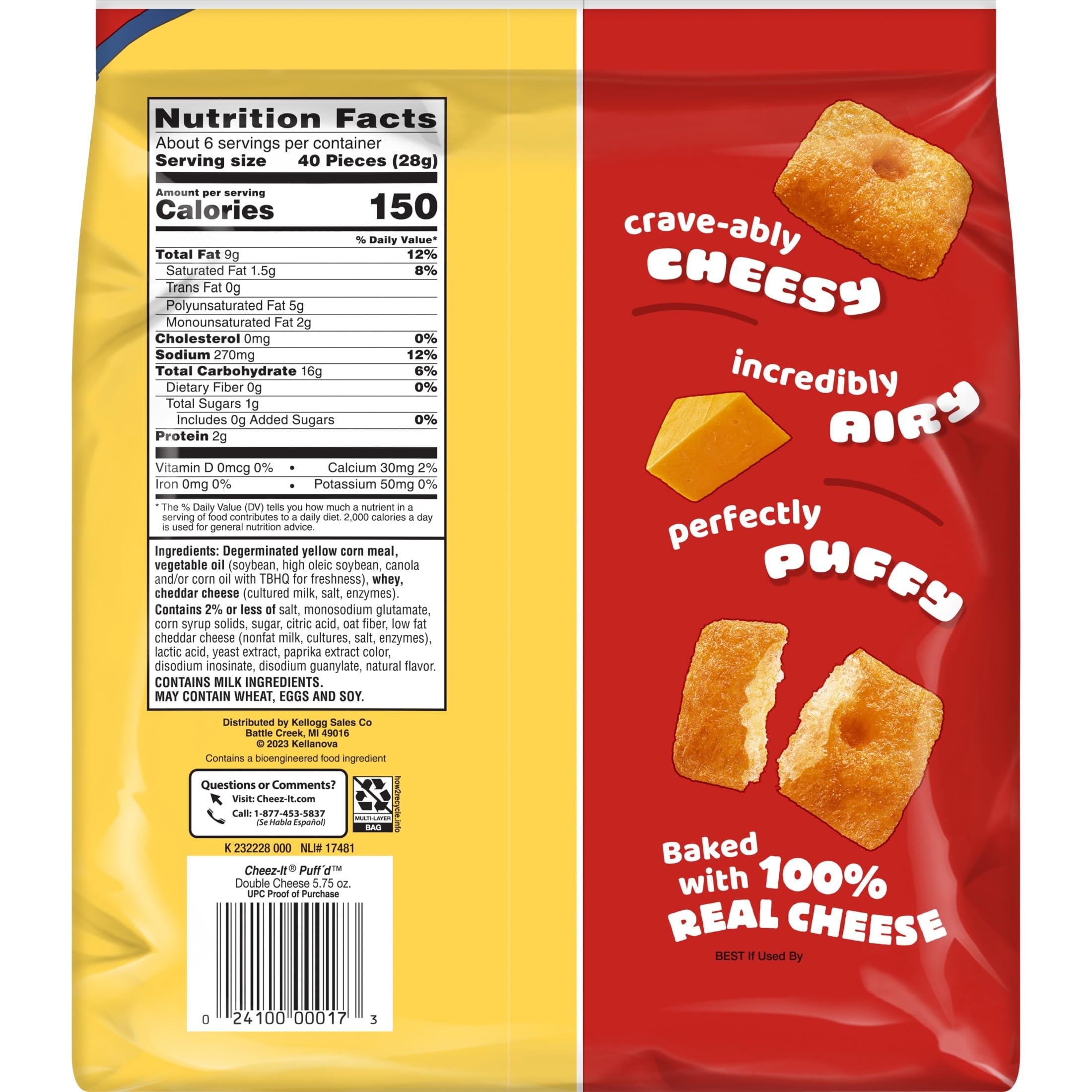 - Includes 6, 5.75-ounce multi-serve bags of ready-to-eat Cheez-It Puff’d Double Cheese Cheesy Baked Snacks; Packaged for freshness and great taste