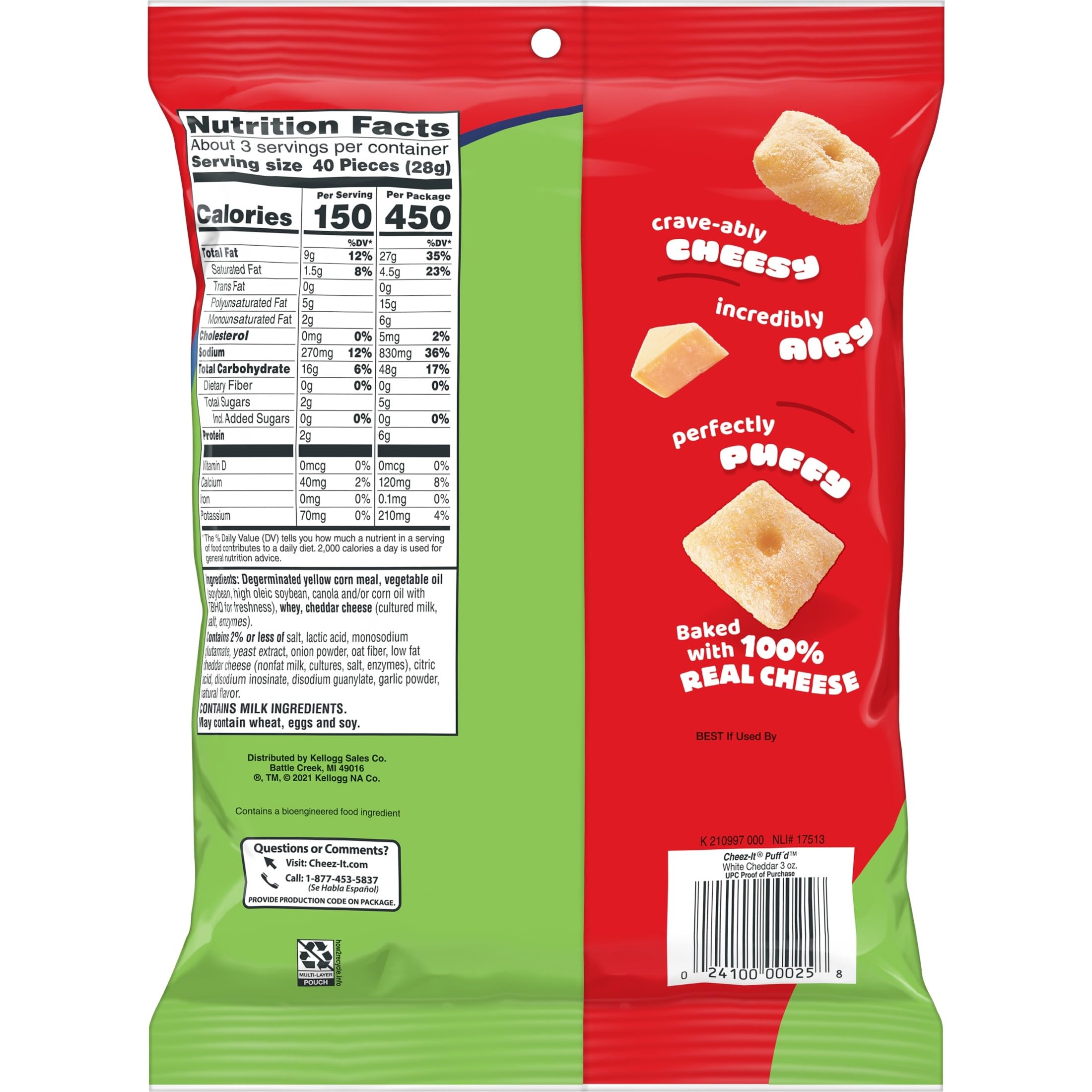 - Includes 6, 3-ounce single-serve pouches of ready-to-eat Cheez-It Puff'd White Cheddar Cheesy Baked Snacks; Packaged for freshness and great taste