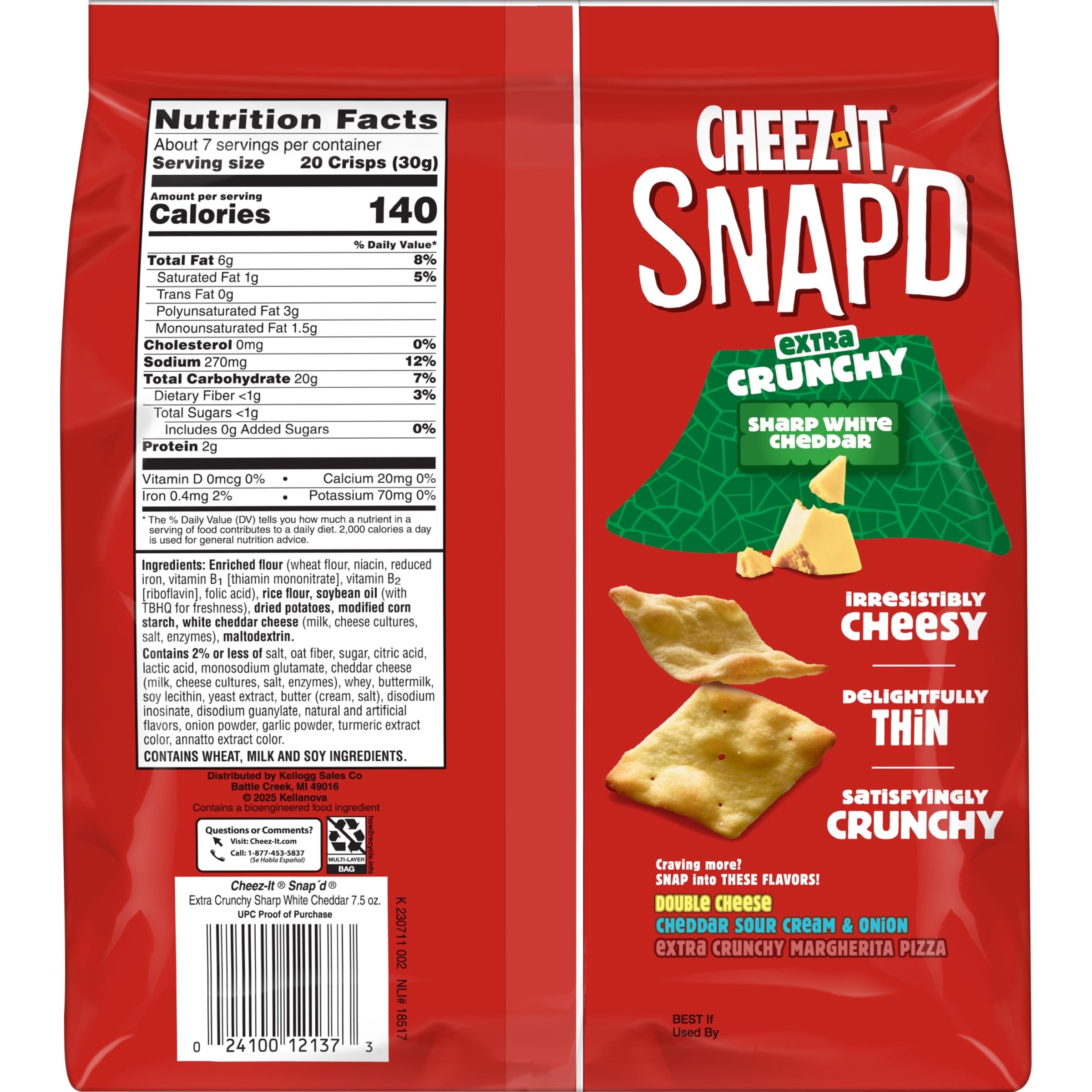 - Includes 1, 7.5oz bag of ready-to-eat Cheez-It Snap'd Extra Crunchy cheesy baked chips; Packaged for freshness and great taste
