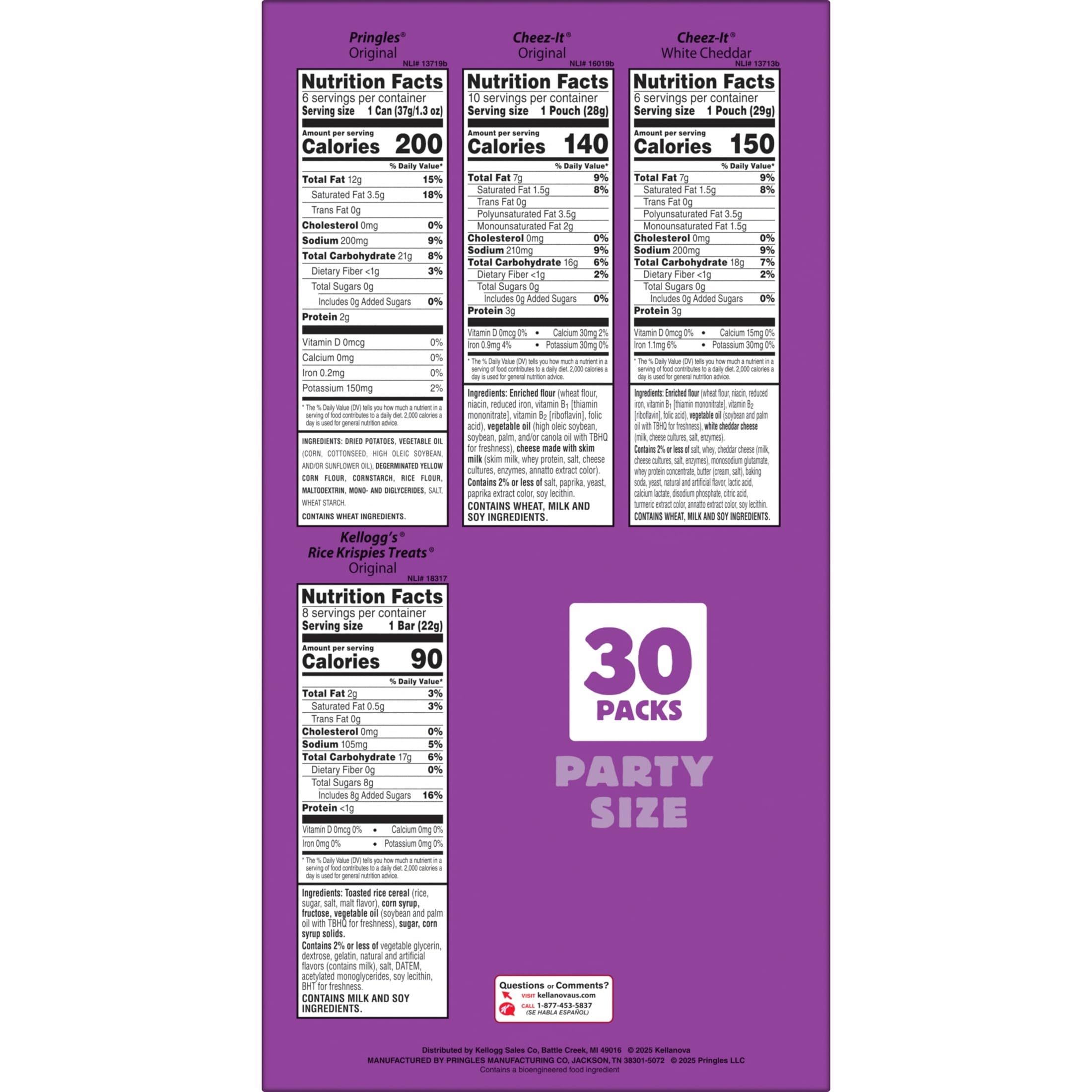 - Variety pack includes Cheez-It Original, Cheez-It White Cheddar, Pringles Original, and Rice Krispies Treats Original snacks